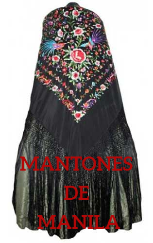 Mantón de Manila: Especie de lienzo de forma cuadrada, de seda y bordado con motivos florales, pájaros y fantasías, (algunos con incrustaciones de marfil), mediante hilos de seda. Sus lados se rematan con un flecado, (dibujo de nudos trenzados a mano), finalizando con los hilos sueltos.